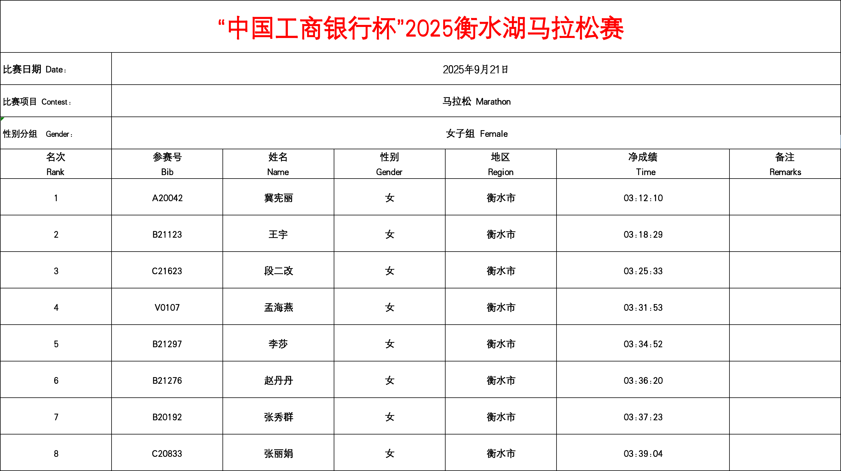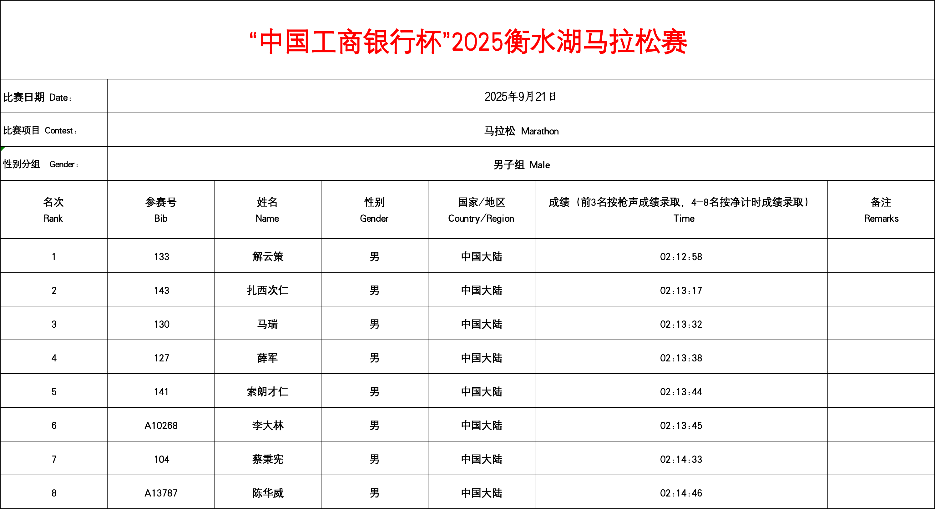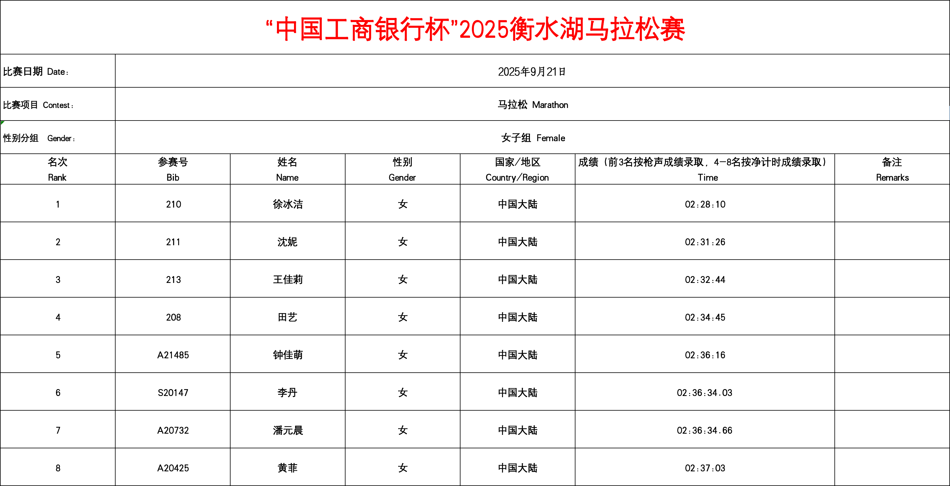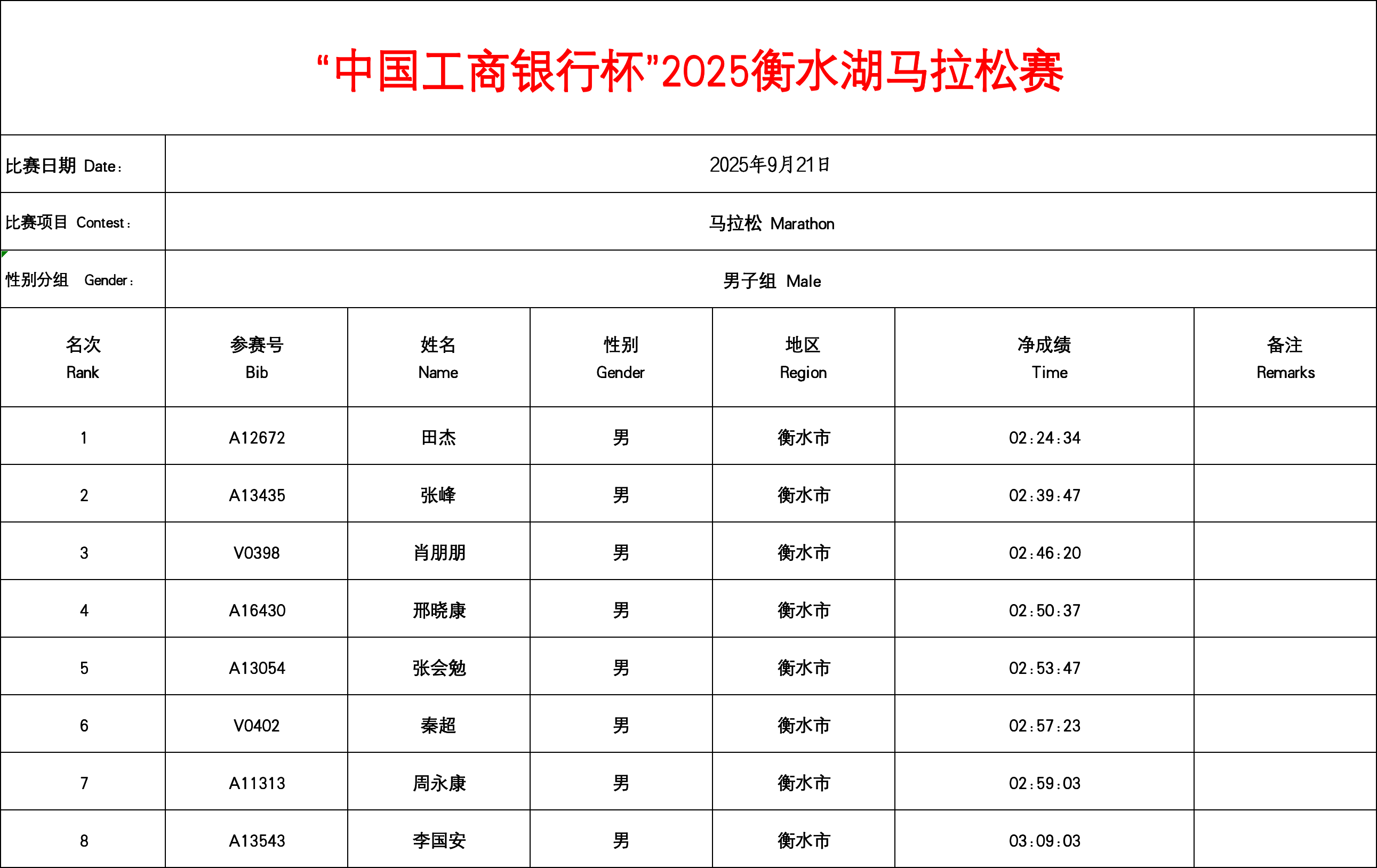 在大家的共同努力下2025衡水湖马拉松赛已落下帷幕,祝贺大家取得了优异的成绩。根据《2025衡水湖马拉松赛竞赛规程》第十一条相关规定,现将获得马拉松男女名次奖前8名奖获奖运动员名单予以公示,公示期结束后将发放相关奖金,欢迎各位跑友进行监督。