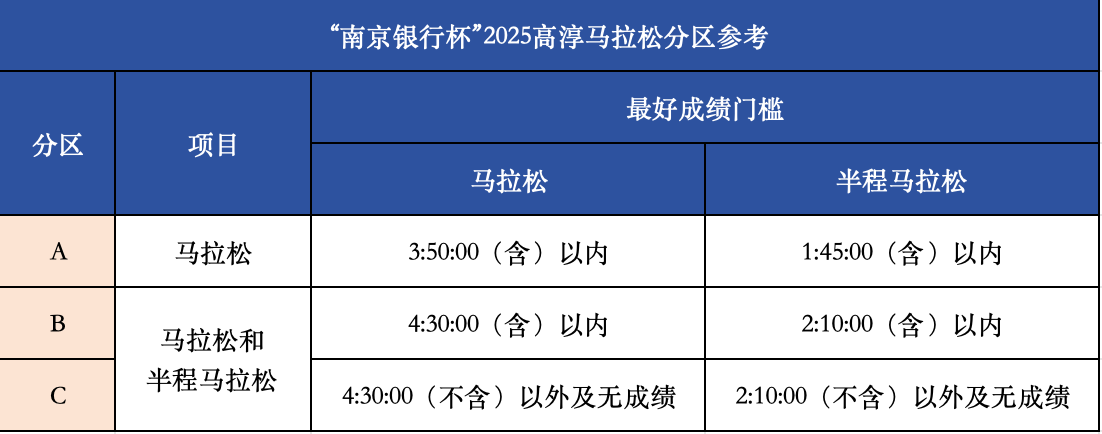 分区依据:按报名运动员在中国马拉松信息平台上2023年1月1日至2025年7月30日期间举办的认证级别为“A类赛事”的马拉松/半程马拉松的最好成绩作为分区依据。