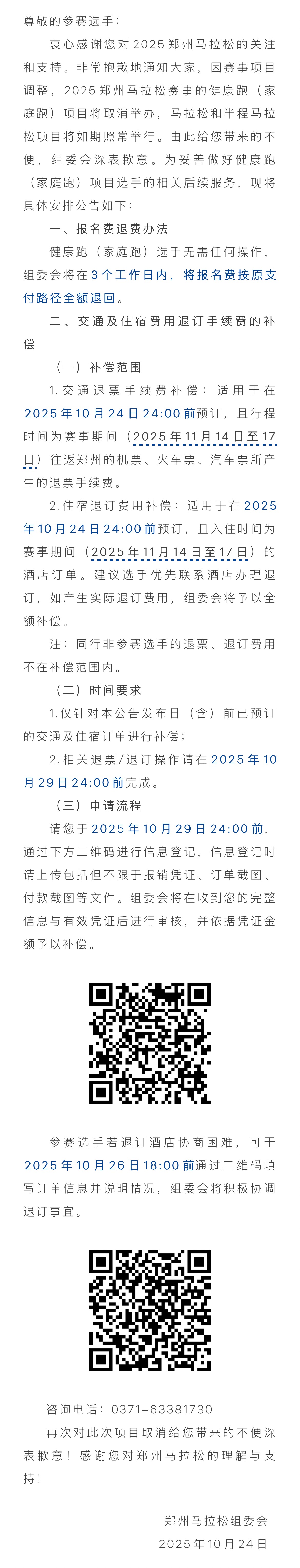 关于2025郑州马拉松取消健康跑(家庭跑)项目的公告