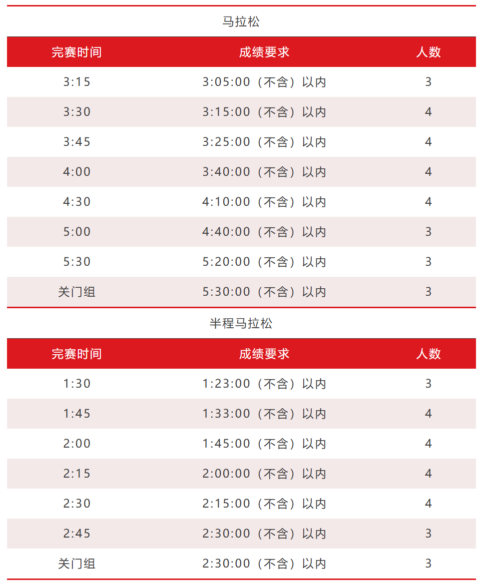 4.按不同配速段的规定时间完成比赛,5公里误差正负不超过30秒;完赛成绩误差正负不超过60秒;