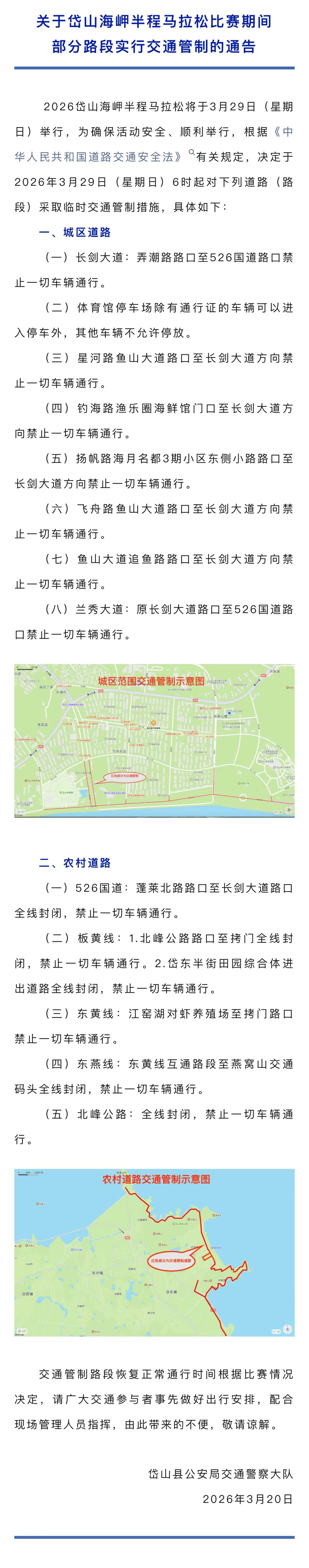 关于岱山海岬半程马拉松比赛期间部分路段实行交通管制的通告