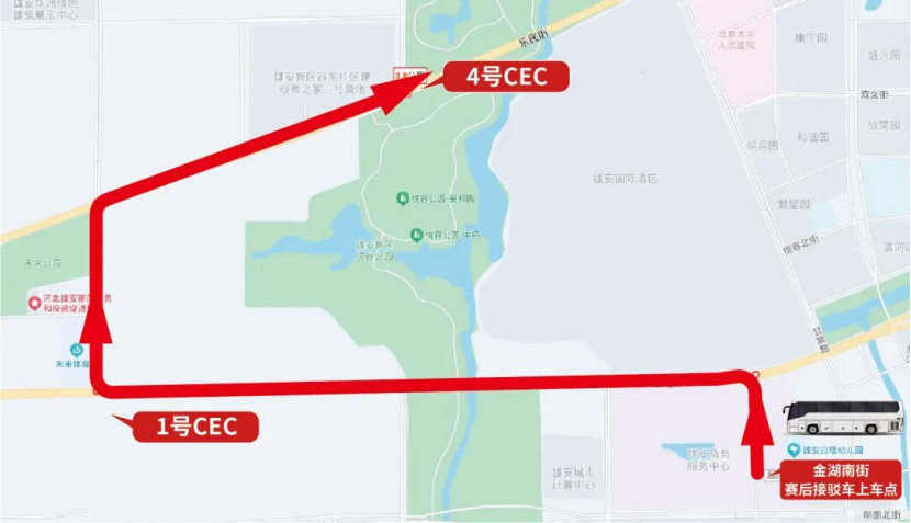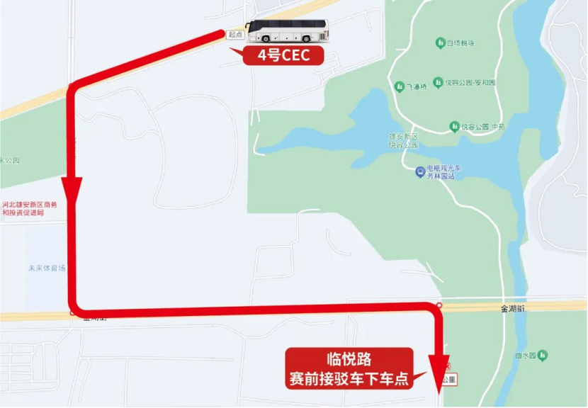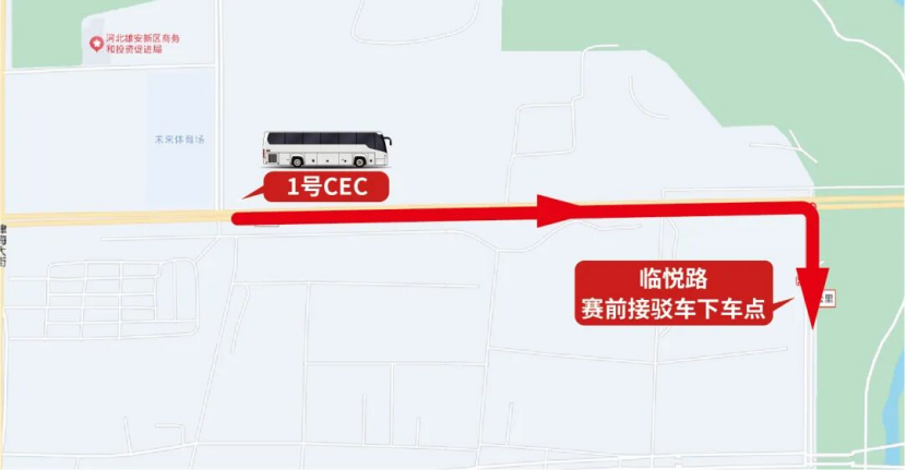 上车点设于雄安高铁站公交候车区,凭参赛号短信免费搭乘,单程约40分钟。