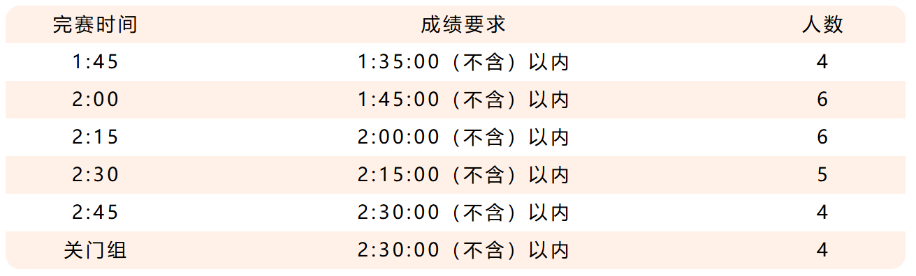 4.按不同配速段的规定时间完成比赛,5公里误差正负不得超过30秒;完赛成绩误差正负不超过60秒;