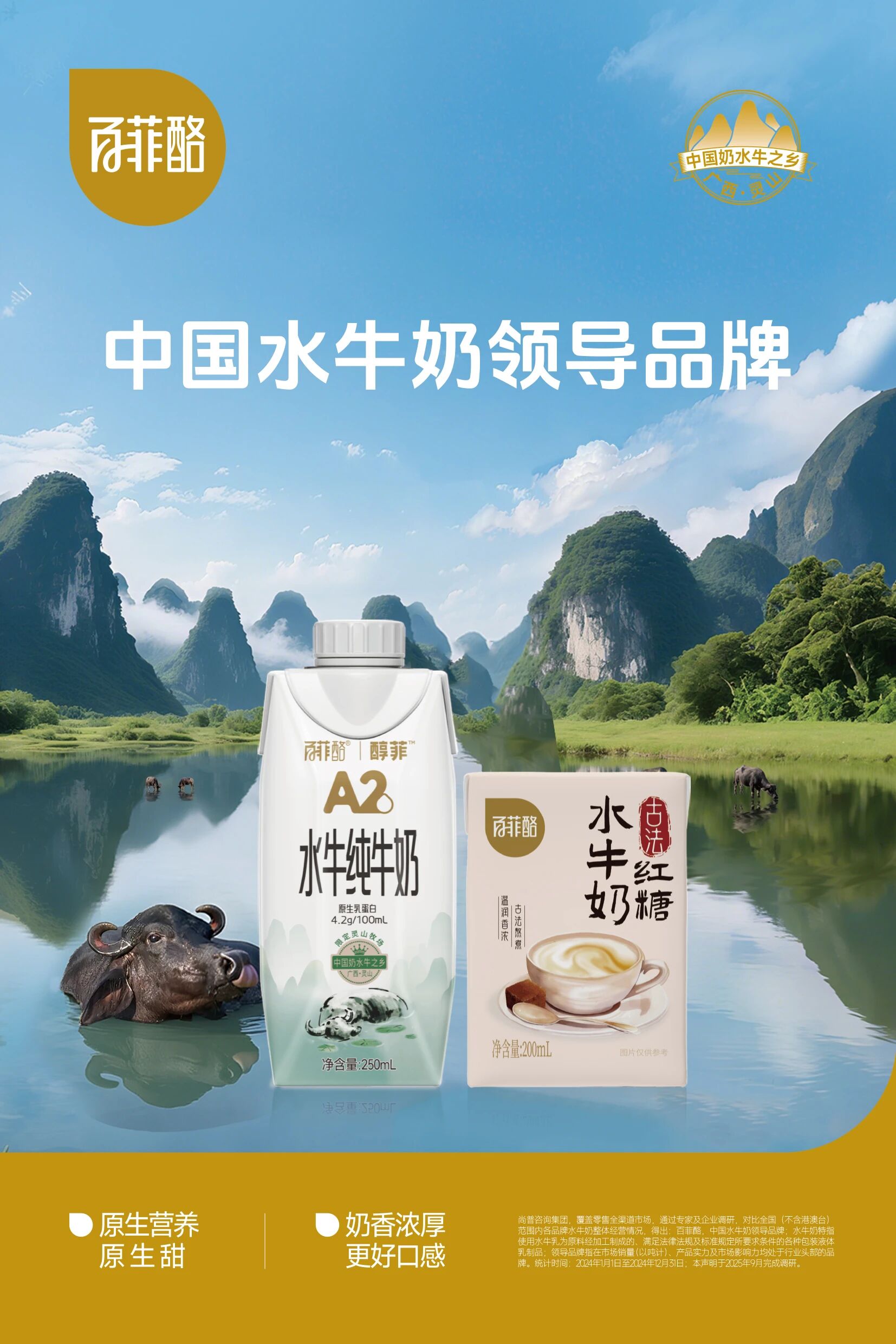 甄选同款灵山山水牧场优质奶水牛奶源,蕴含原生A2 β - 酪蛋白,亲和人体易吸收,无负担适配运动人群。每100mL含4.2g优质蛋白质,纯净无添加,保留水牛奶原生鲜醇与营养,带来轻盈纯粹的能量补给,守护奔跑路上的每一份健康与活力。
